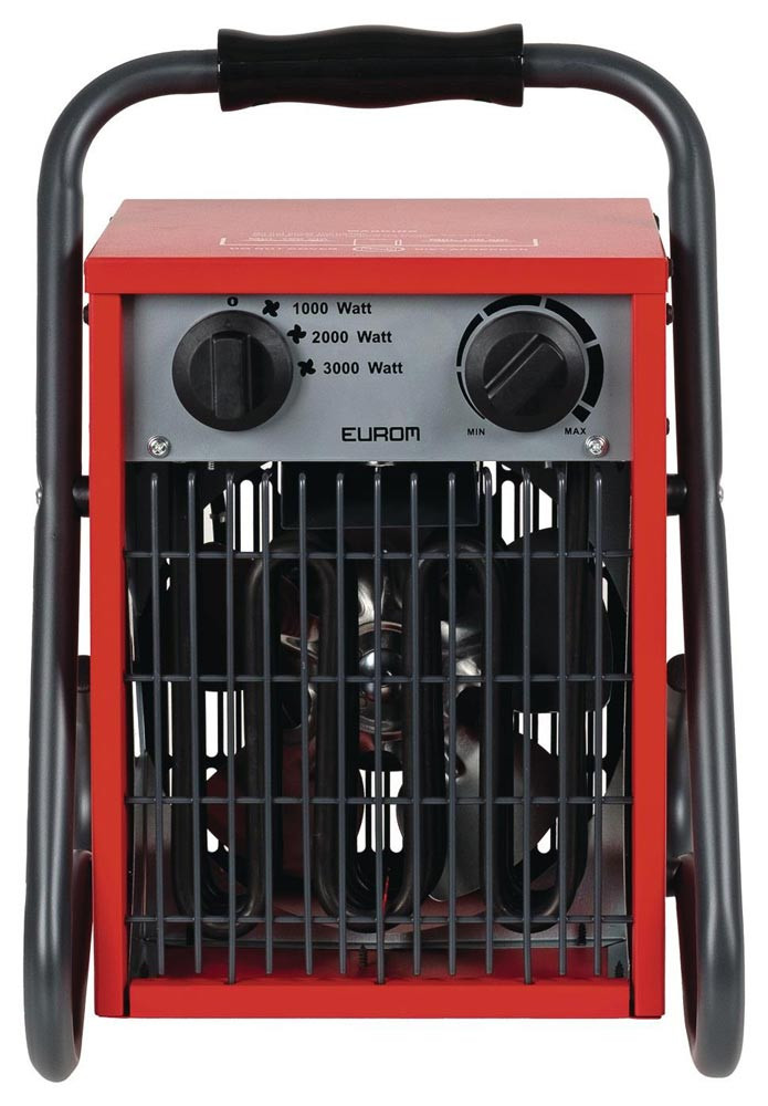 für den Einsatz in Werkstätten, Schuppen oder Garagen · 3000 W · geringe Größe · mit Lüfter und Thermostat · in 3 Positionen einstellbar · spritzwassergeschützt (IP24) · robustes Metallgehäuse · mit Überhitzungsschutz