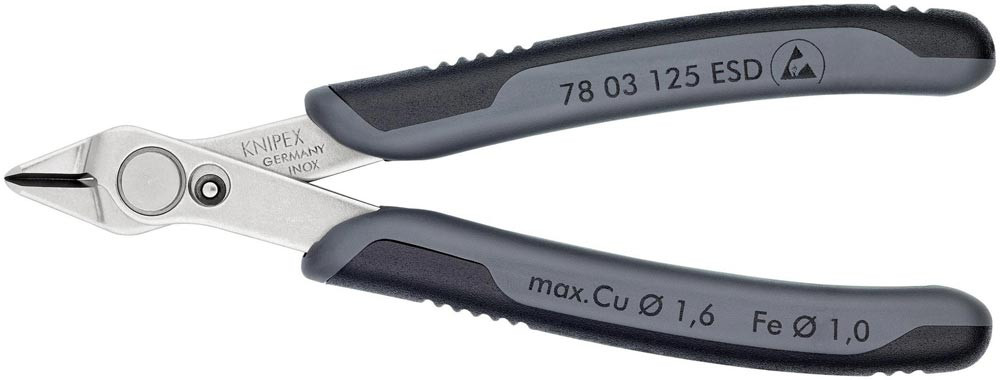ESD · für feinste Schneidarbeiten z. B. in Elektronik und Feinmechanik · geschliffene, sehr scharfe Schneiden · Gelenk mit Edelstahl-Niet · Schneiden zusätzlich induktiv gehärtet · mit Öffnungsfeder und Öffnungsbegrenzung · Inox -Werkzeugstahl · elektrisch ableitend - dissipativ
