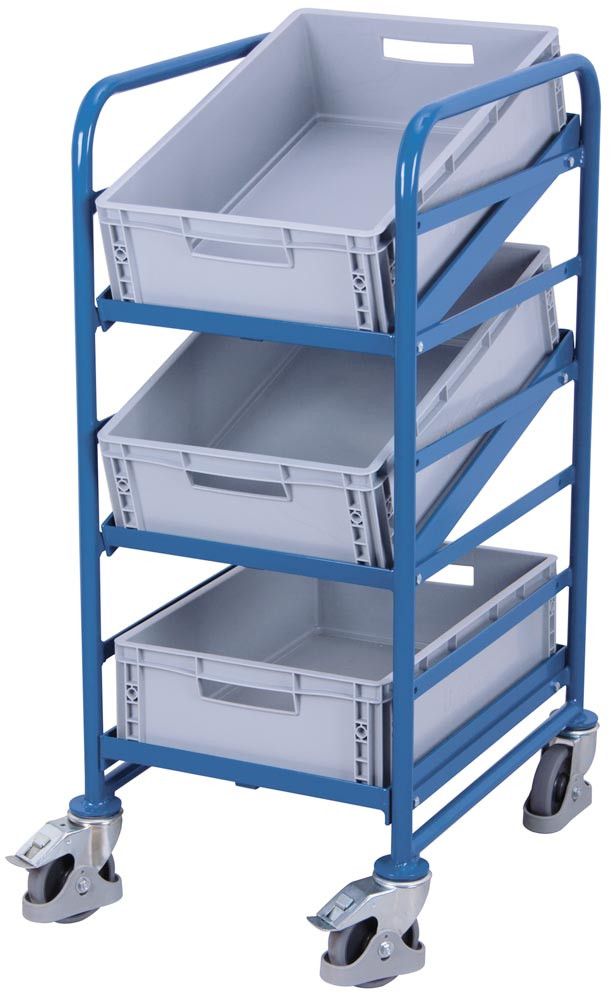 Eurokastenwagen, 3 offene Rahmen, 3 Kunststoffkästen, Ladefläche LxB 410x610 mm, Außenmaße LxBxH 520x665x1160 mm, Traglast 200 kg