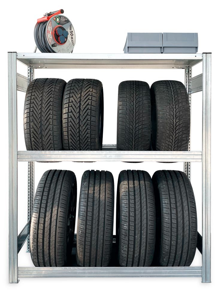 · Steckregal in Industriequalität für die Lagerung von Rädersätzen · Integrierter Abdeckboden bietet weitere Abstellmöglichkeiten· Per Paketdienst geliefert · Einfache Montage · Regalrahmen fertig montiert · Vielfältig erweiterbar