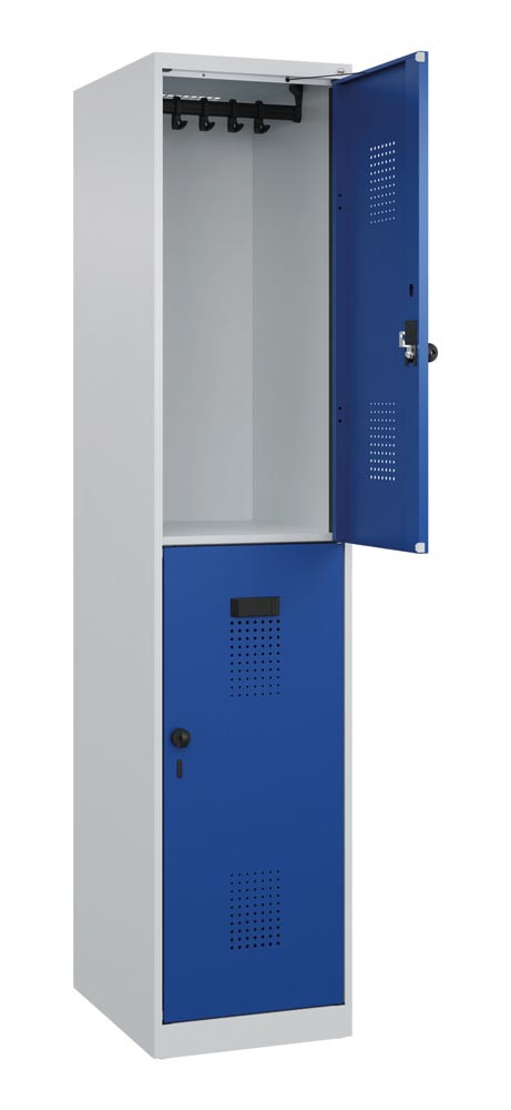 Fächerschrank, Stahl, doppelstöckig, 1x2 Fächer, Abt.B 400 mm, bodenstehend, Drehriegel, BxTxH 400x500x1850 mm, RAL 7035/5010 EP560170