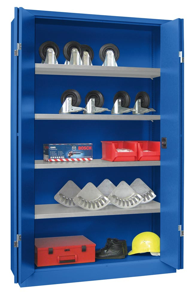 ∙ Stabile Stahlblechkonstruktion ∙ Oberfläche pulverbeschichtet ∙ Schränke mit gemeinsam verschließbaren Vollblech-Falttüren und Verstärkungstaschen ∙ Die Türen sind über einen dreiriegeligen Drehgriff mit integriertem Zylinderschloss inkl. 2 Schlüsseln verschließbar ∙ Böden im Raster von 17 mm höhenverstellbar, Belastbarkeit je Boden 80 kg bei gleichmäßig verteilter Last ∙ Max. Gehäusebelastbarkeit 600 kg