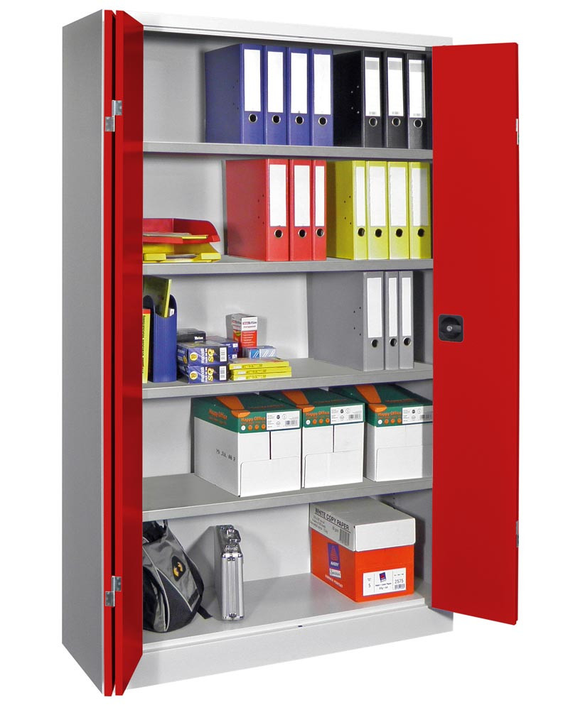 ∙ Stabile Stahlblechkonstruktion ∙ Oberfläche pulverbeschichtet ∙ Schränke mit gemeinsam verschließbaren Vollblech-Falttüren und Verstärkungstaschen ∙ Die Türen sind über einen dreiriegeligen Drehgriff mit integriertem Zylinderschloss inkl. 2 Schlüsseln verschließbar ∙ Böden im Raster von 17 mm höhenverstellbar, Belastbarkeit je Boden 80 kg bei gleichmäßig verteilter Last ∙ Max. Gehäusebelastbarkeit 600 kg