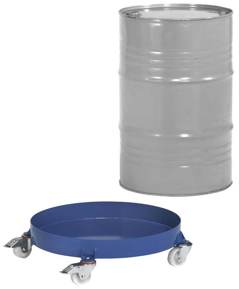 Fassroller für 200-l-Fässer, geschlossene Stahlblechwanne öldicht, Traglast 250 kg, RAL 5007 brillantblau