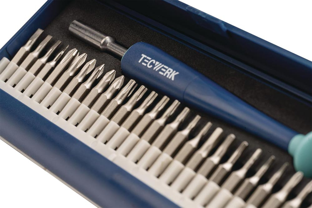 Handgriff mit magnetischem Bithalter und drehbarem Kopf · komplett mit 28 Mikro-Bits