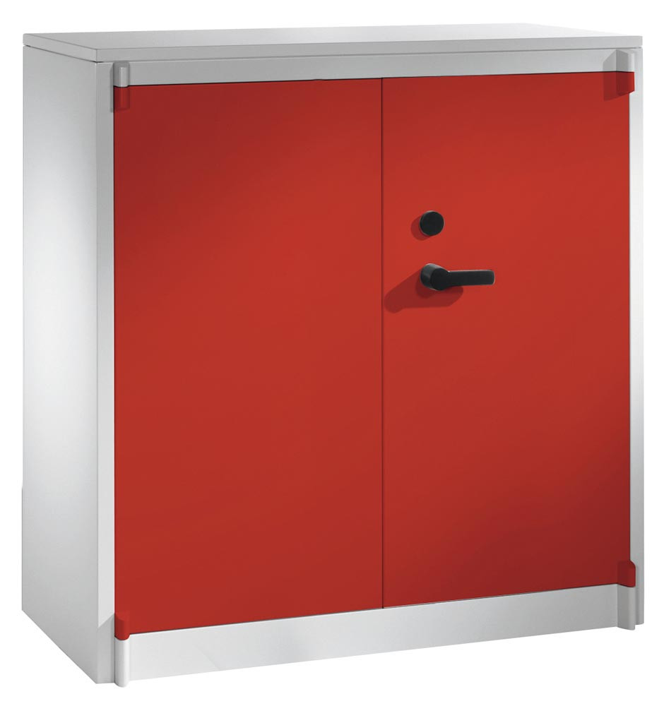 Feuergeschützter Flügeltürenschrank, BxTxH 930x500x1950 mm, 2-türig, 4 Fachböden, RAL 7035/3003 lichtgrau/rubinrot EP519409
