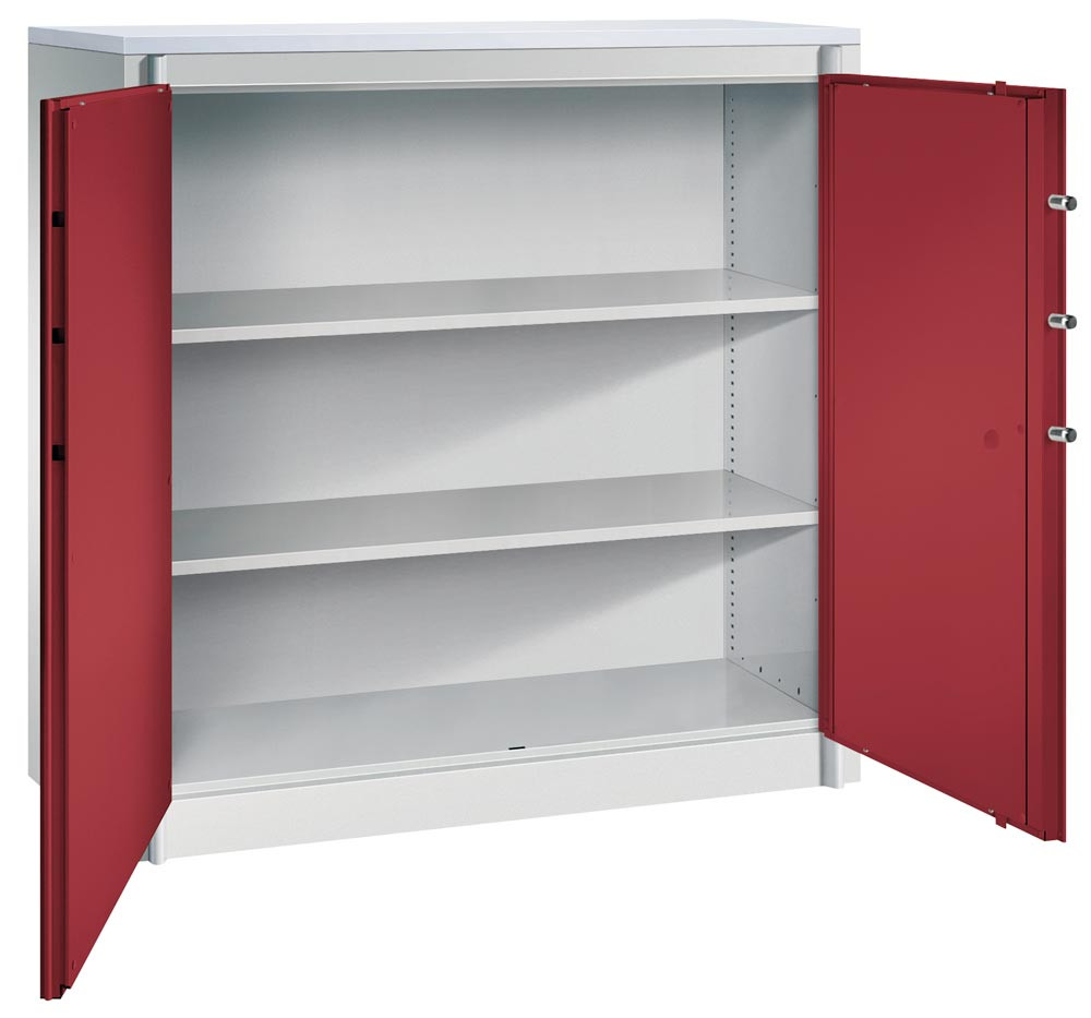 · Allseitig doppelwandig, zwischen den Wandungen 25 mm starke Spezial-Isolierplatten Klasse A1, nicht brennbar nach DIN 4102 · Flügeltüren lagern oben und unten in stabilen Drehbolzen · Links und rechts je 3 Sicherungsbolzen, die in die Seitenwände einrasten · 5-riegeliges Bolzenriegelwerk (seitlich 3 x, oben/unten je 1 x) · Doppelbart-Sicherheitsschloss mit 2 Schlüsseln · Schrankgriffe in schwarz · Traglast pro Einlegeboden ca. 70 kg (bei gleichmäßig verteilter Last) ∙ Halbhohe Schränke mit DBS-Abdeckplatte, lichtgrau