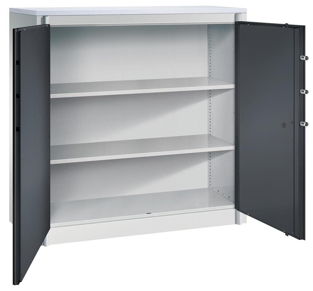 · Allseitig doppelwandig, zwischen den Wandungen 25 mm starke Spezial-Isolierplatten Klasse A1, nicht brennbar nach DIN 4102 · Flügeltüren lagern oben und unten in stabilen Drehbolzen · Links und rechts je 3 Sicherungsbolzen, die in die Seitenwände einrasten · 5-riegeliges Bolzenriegelwerk (seitlich 3 x, oben/unten je 1 x) · Doppelbart-Sicherheitsschloss mit 2 Schlüsseln · Schrankgriffe in schwarz · Traglast pro Einlegeboden ca. 70 kg (bei gleichmäßig verteilter Last) ∙ Halbhohe Schränke mit DBS-Abdeckplatte, lichtgrau