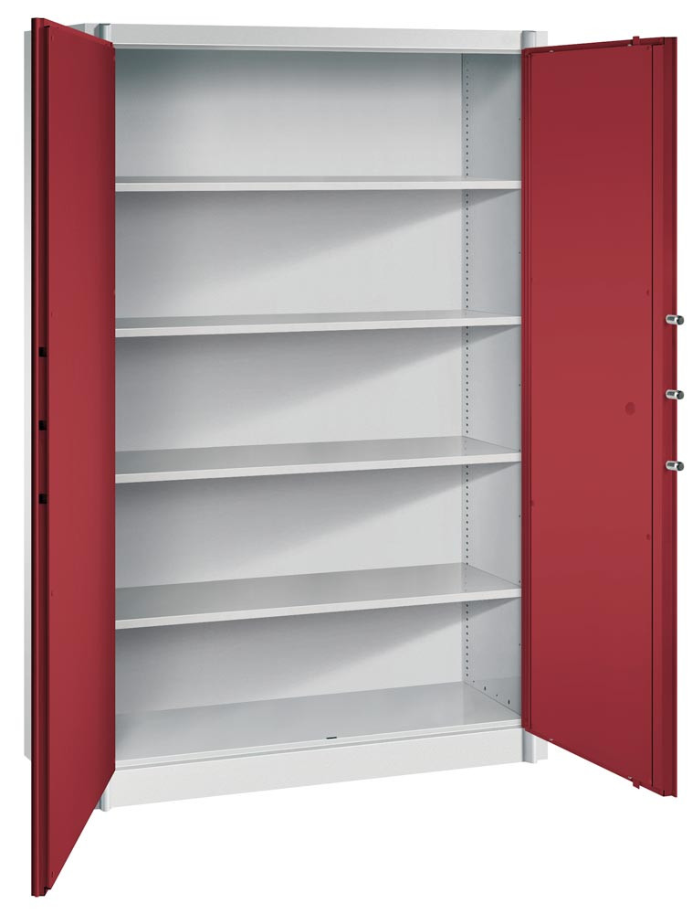 Feuergeschützter Flügeltürenschrank, BxTxH 1200x500x1950 mm, 2-türig, 4 Fachböden, RAL 7035/3003 lichtgrau/rubinrot