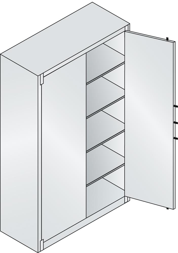 · Allseitig doppelwandig, zwischen den Wandungen 25 mm starke Spezial-Isolierplatten Klasse A1, nicht brennbar nach DIN 4102 · Flügeltüren lagern oben und unten in stabilen Drehbolzen · Links und rechts je 3 Sicherungsbolzen, die in die Seitenwände einrasten · 5-riegeliges Bolzenriegelwerk (seitlich 3 x, oben/unten je 1 x) · Doppelbart-Sicherheitsschloss mit 2 Schlüsseln · Schrankgriffe in schwarz · Traglast pro Einlegeboden ca. 70 kg (bei gleichmäßig verteilter Last) ∙ Halbhohe Schränke mit DBS-Abdeckplatte, lichtgrau