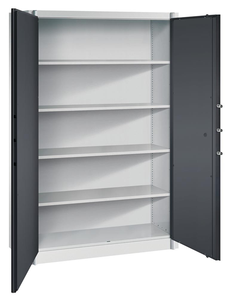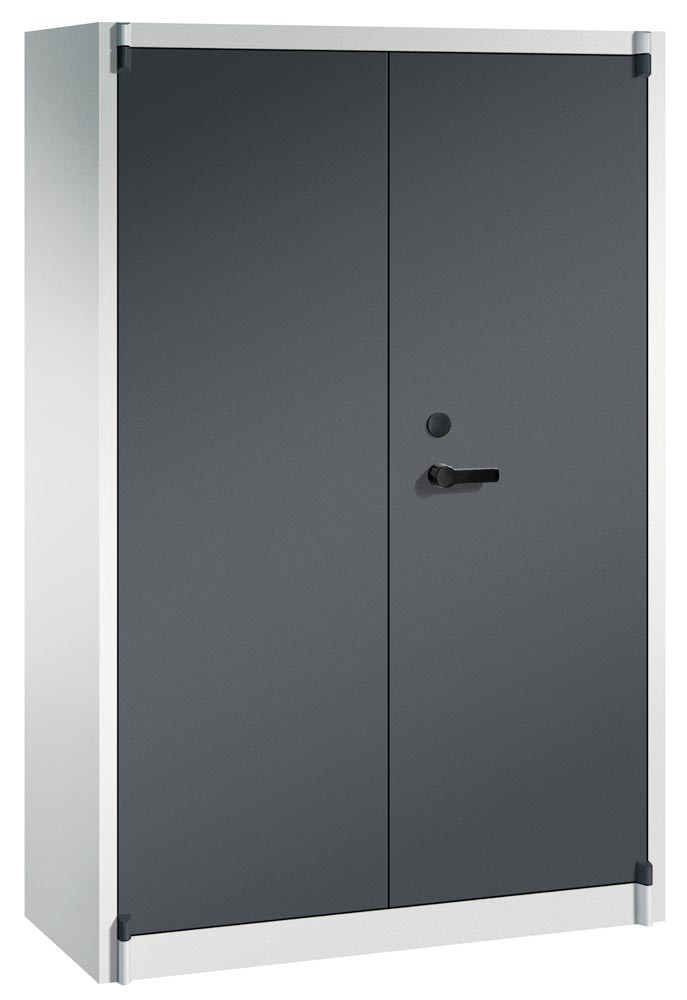 Feuergeschützter Flügeltürenschrank, BxTxH 1200x500x1950 mm, 2-türig, 4 Fachböden, RAL 7035/7021 lichtgrau/schwarzgrau
