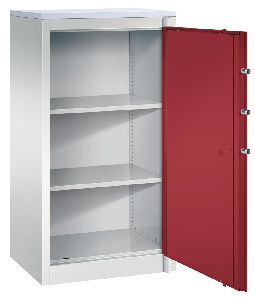 · Allseitig doppelwandig, zwischen den Wandungen 25 mm starke Spezial-Isolierplatten Klasse A1, nicht brennbar nach DIN 4102 · Flügeltüren lagern oben und unten in stabilen Drehbolzen · Links und rechts je 3 Sicherungsbolzen, die in die Seitenwände einrasten · 5-riegeliges Bolzenriegelwerk (seitlich 3 x, oben/unten je 1 x) · Doppelbart-Sicherheitsschloss mit 2 Schlüsseln · Schrankgriffe in schwarz · Traglast pro Einlegeboden ca. 70 kg (bei gleichmäßig verteilter Last) ∙ Halbhohe Schränke mit DBS-Abdeckplatte, lichtgrau