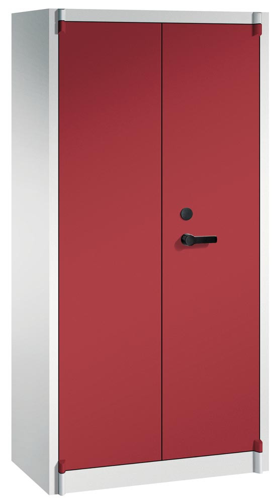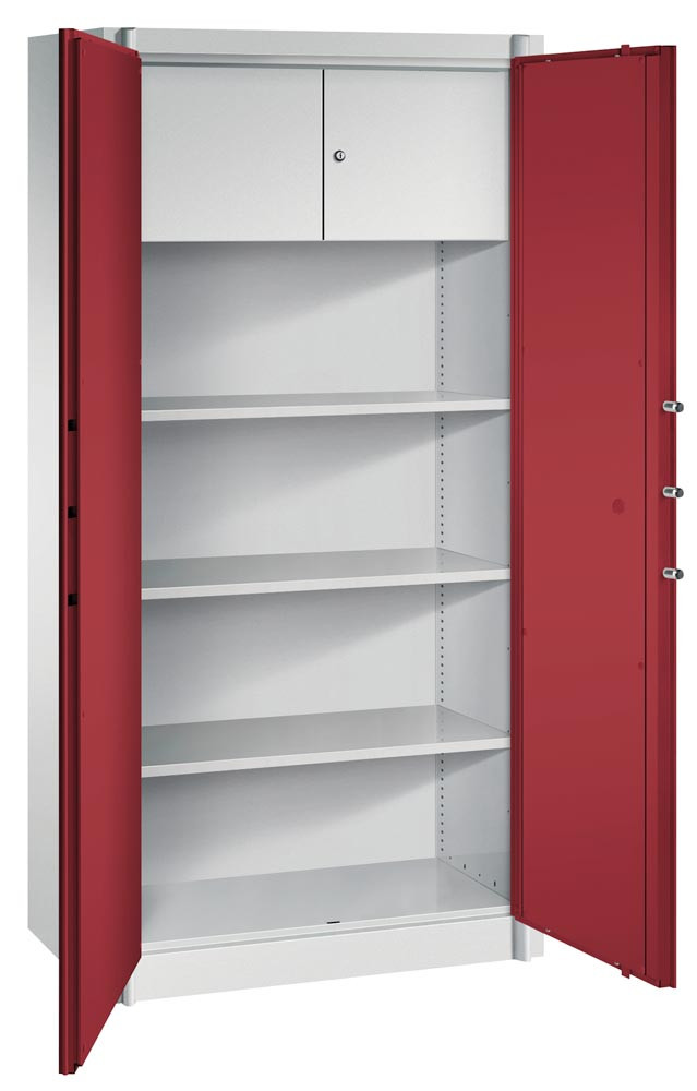 Feuergeschützter Flügeltürenschrank, BxTxH 930x500x1950 mm, 2-türig, 3 Fachböden, 1 Schließfach, RAL 7035/3003 lichtgrau/rubinrot
