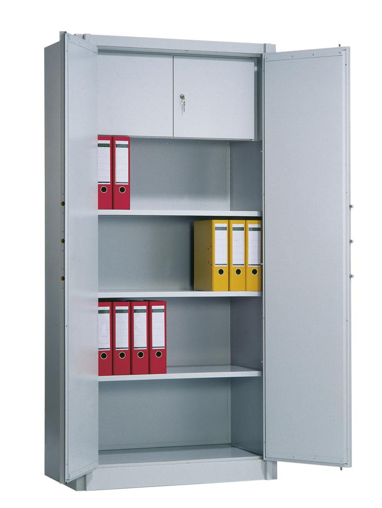 Feuergeschützter Flügeltürenschrank, BxTxH 930x500x1950 mm, 2-türig, 3 Fachböden, 1 Schließfach, RAL 7035 lichtgrau