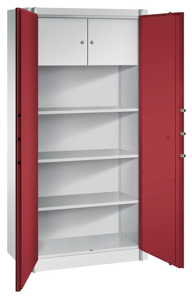 Feuergeschützter Flügeltürenschrank, BxTxH 930x500x1950 mm, 2-türig, 3 Fachböden, 2 Schließfächer, RAL 7035/3003 lichtgrau/rubinrot