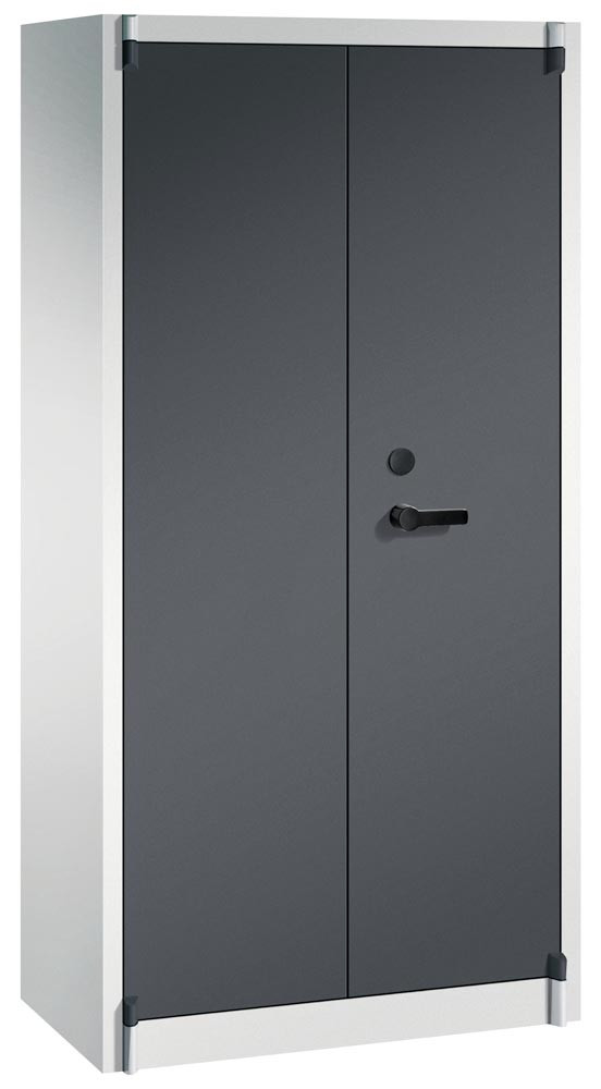 Feuergeschützter Flügeltürenschrank, BxTxH 930x500x1950 mm, 2-türig, 4 Fachböden, RAL 7035/7021 lichtgrau/schwarzgrau EP519411