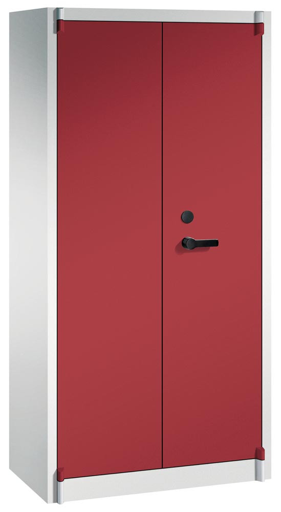 Feuergeschützter Flügeltürenschrank, BxTxH 930x500x1950 mm, 2-türig, 4 Fachböden, RAL 7035/3003 lichtgrau/rubinrot