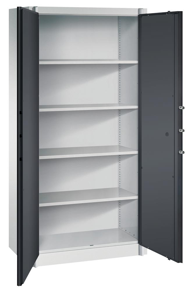 Feuergeschützter Flügeltürenschrank, BxTxH 930x500x1950 mm, 2-türig, 4 Fachböden, RAL 7035/7021 lichtgrau/schwarzgrau