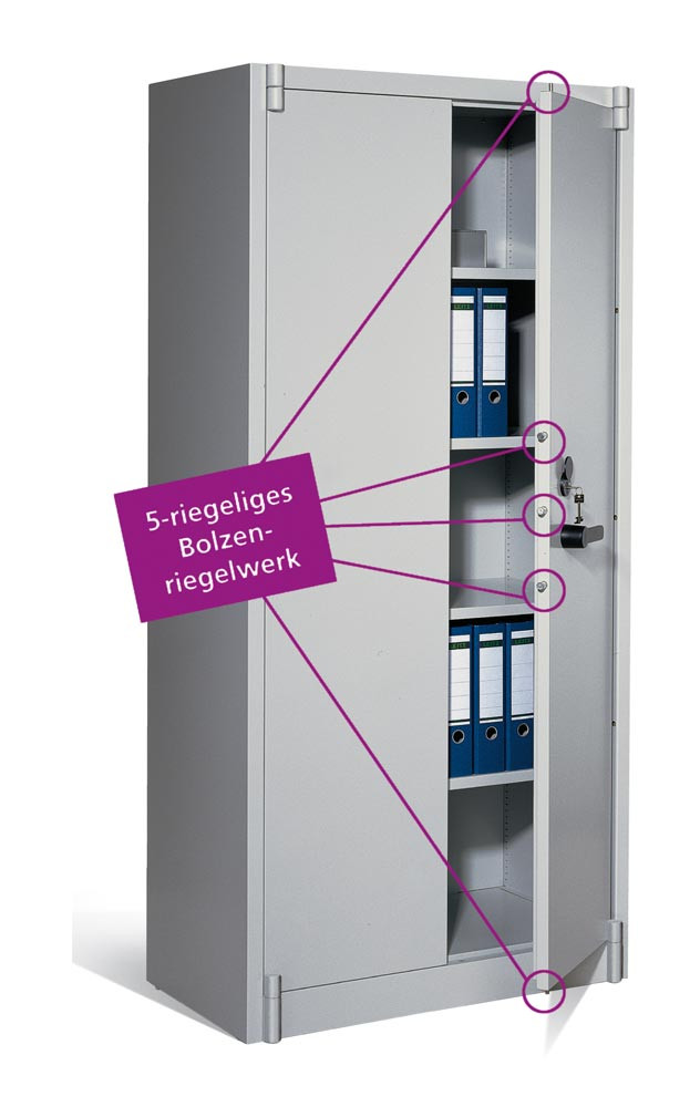 · Allseitig doppelwandig, zwischen den Wandungen 25 mm starke Spezial-Isolierplatten Klasse A1, nicht brennbar nach DIN 4102 · Flügeltüren lagern oben und unten in stabilen Drehbolzen · Links und rechts je 3 Sicherungsbolzen, die in die Seitenwände einrasten · 5-riegeliges Bolzenriegelwerk (seitlich 3 x, oben/unten je 1 x) · Doppelbart-Sicherheitsschloss mit 2 Schlüsseln · Schrankgriffe in schwarz · Traglast pro Einlegeboden ca. 70 kg (bei gleichmäßig verteilter Last) ∙ Halbhohe Schränke mit DBS-Abdeckplatte, lichtgrau