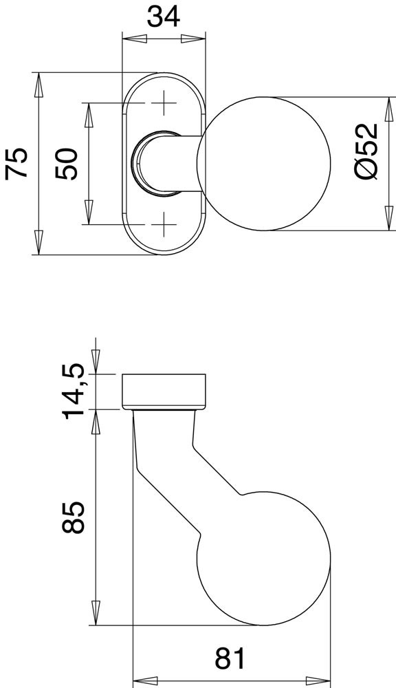 für Feuerschutz-Rahmentüren · Norm DIN 18273 / DIN EN 1906 · gekröpft · fest auf ovaler Rosette · M 12 Gewinde · Rosette Stärke 14,5 mm · Höhe 75 mm · Breite 34 mm · unsichtbare Verschraubung · Lieferung ohne Stift und Schrauben