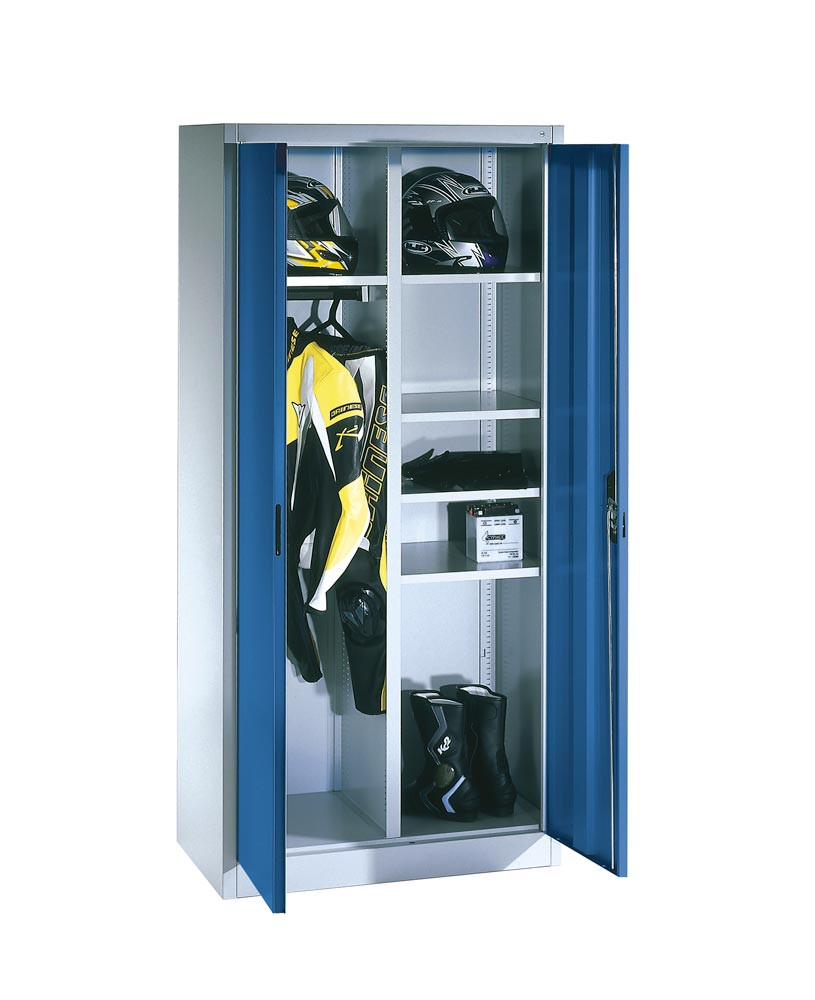 Flügeltürenschrank, BxTxH 930x500x1950 mm, links 1 Hutboden + 1 Kleiderstange, rechts 4 halbe Böden, RAL 7035/5010 lichtgrau/enzianblau
