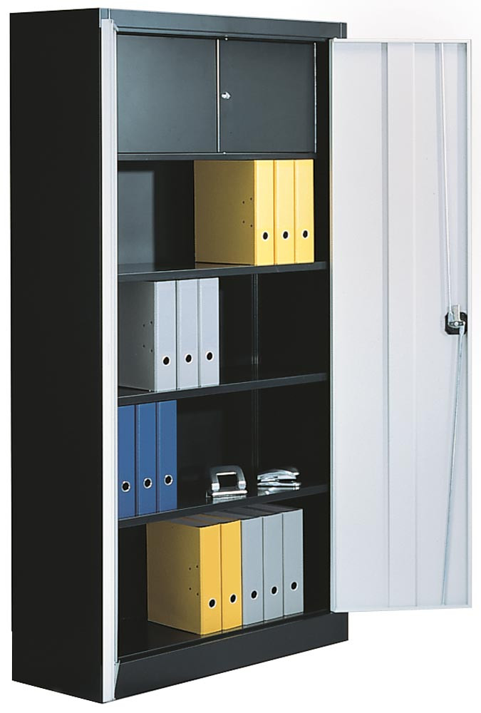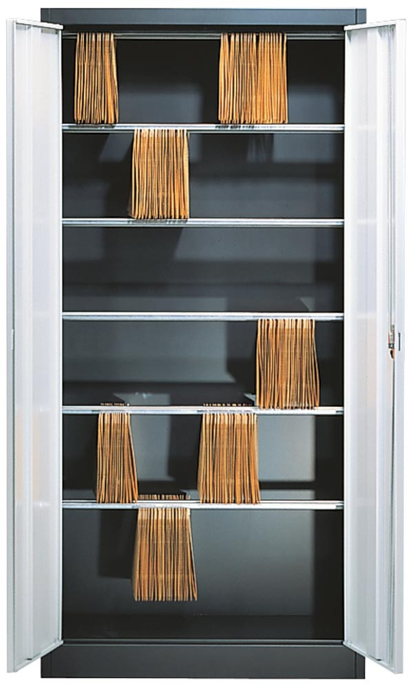 ∙ Stabil verschweißte Stahlkonstruktion mit verwindungsfesten Türen mit Kastenversteifung · Flügeltüren mit Dreiriegelverschluss und Drehzylinder-Sicherheitsschloss, verschiedenschließend ∙ Türöffnungswinkel ca. 135° · Fachböden verstellbar im 35 mm Raster · Inneneinrichtung in schwarz · Traglast pro Fachboden 65 kg (bei gleichmäßig verteilter Last)
