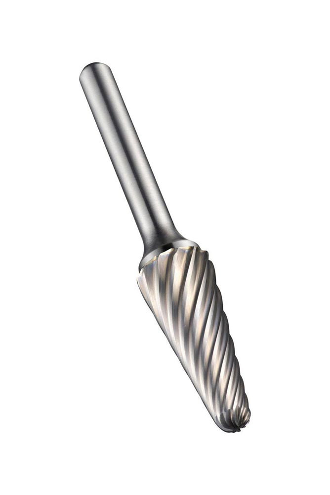 Kugelkegel-Frässtift (Form L) · Durchmesser 8mm mit 25.4mm Schnittlänge · 70mm Gesamtlänge und 6mm Schaft · VHM mit gehärtetem Stahlschaft und blanker Oberfläche · VA einseitigem Schnitt mit mittlerer Zahnteilung zum Vergrößern von Löchern · Abrunden von Kanten und Oberflächenveredeln in engen Winkeln oder anderen schwer zugänglichen Bereichen in Edelstahl