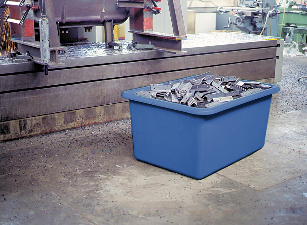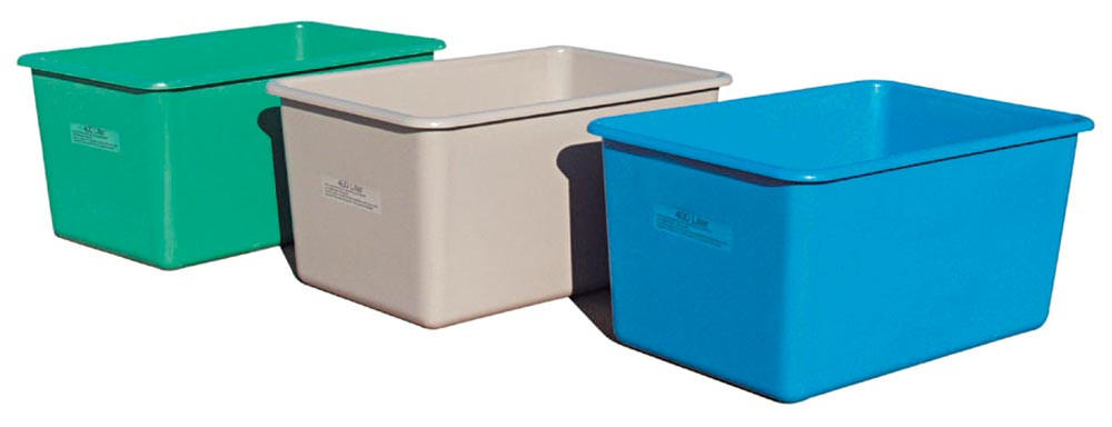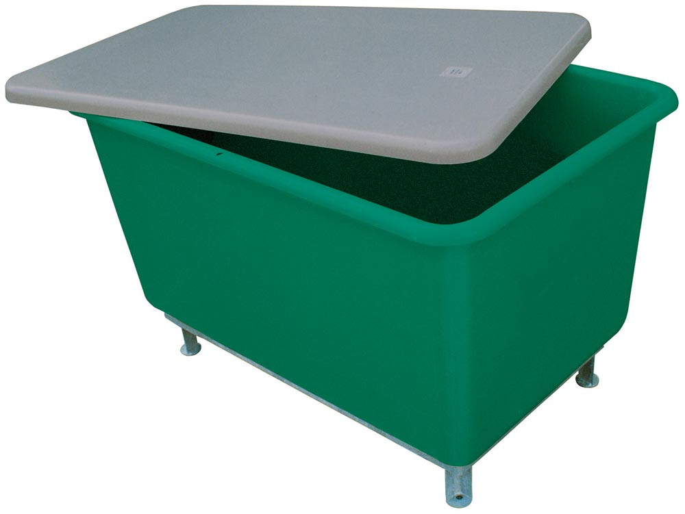 ∙ Für Transport und Lagerung von Schüttgütern, Flüssigkeiten, Kleinteilen etc. ∙ Stabile Ausführung aus glasfaserverstärktem Kunststoff ∙ Temperaturbeständig von -30 °C bis +40 °C ∙ Beständig gegen viele Säuren und Laugen (bitte anfragen) ∙ Korrosionsfest und witterungsbeständig ∙ Glatte Innen- und Außenwände, daher leicht zu reinigen ∙ Nach unten konisch zulaufende Seitenwände ∙ Leer platzsparend ineinander stapelbar · Als Zubehör gegen Aufpreis: Fußgestell oder Lenkrollengestell, sowie Deckel und Messingarmaturen