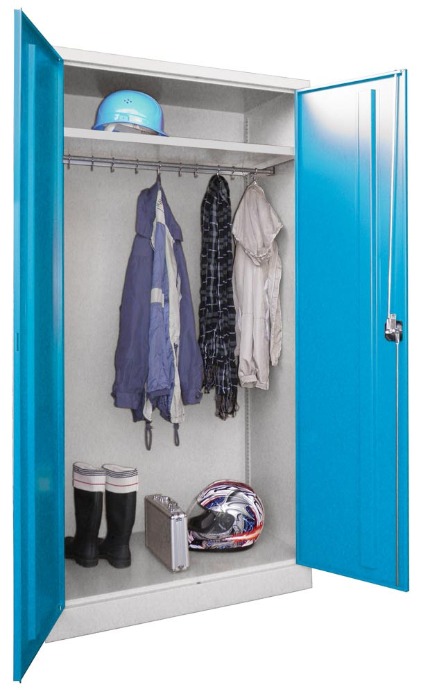 Garderobenschrank, durchg. beschichteter Hutboden, darunter Stange mit 10 Haken, Zyl.-Schl., BxTxH 1000x500x1950 mm, RAL 5010 EP528623