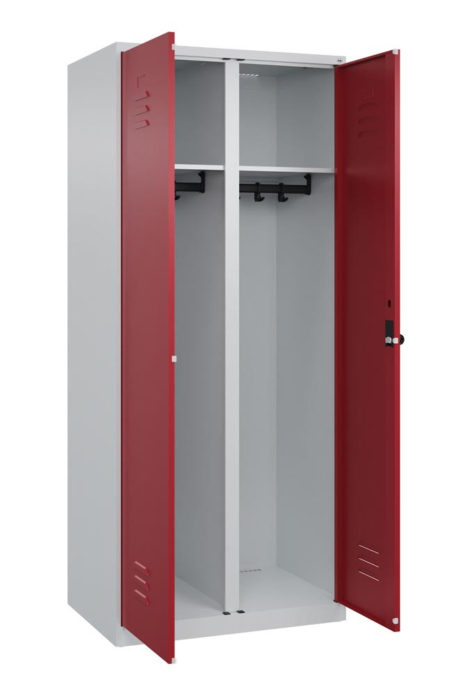 Garderobenschrank, paarw. zuein. schlagende Türen, BxTxH 800x500x1850 mm, 2 Abteile, Abt.B 400 mm, Bodenstehend, Drehriegel, Farbwahl