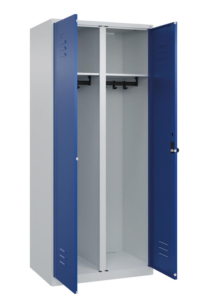 Garderobenschrank, paarw. zuein. schlagende Türen, BxTxH 800x500x1850 mm, 2 Abteile, Abt.B 400 mm, Bodenstehend, Drehriegel, RAL 7035/5010 EP559340