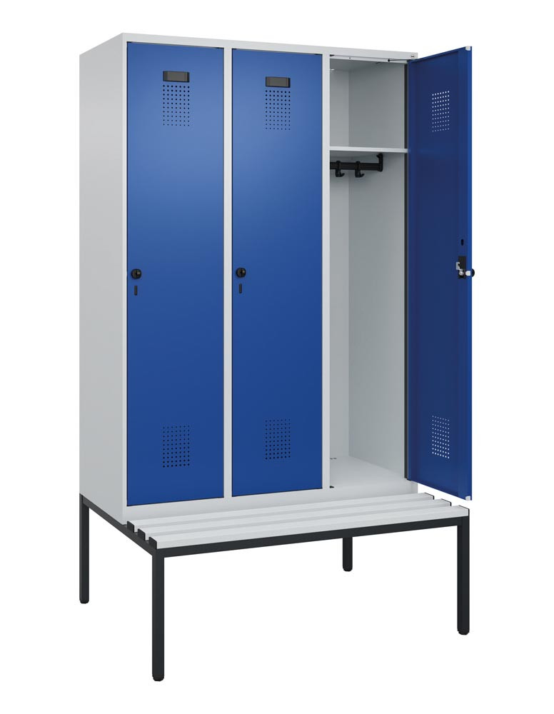 Garderobenschrank, untergeb. Sitzbank, Kunststoff-Sitzleisten, 3 Abteile, Abt.B 400 mm, Drehriegel, BxTxH 1200x500x2120 mm, RAL 7035/5010