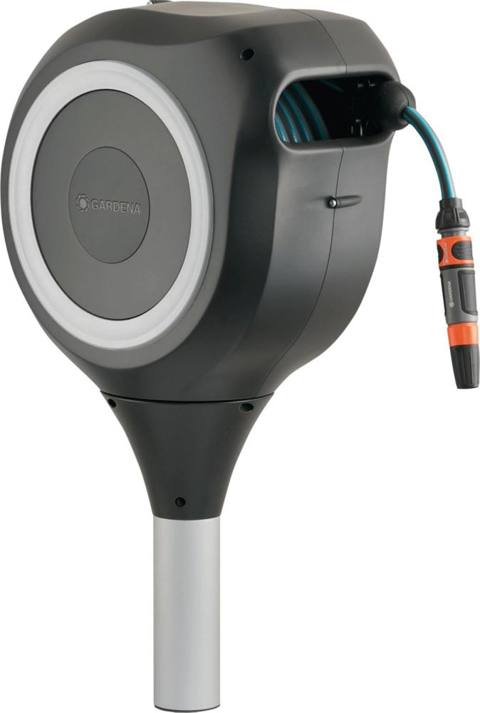 mit flexiblem Anschlussschlauch, Systemteilen und Reinigungsspritze, mit 2 Sprühstrahloptionen · mit Metallstandfuß/Erdspieß, wird mit Hilfe der Montagestange in den Rasen gedreht und der Schlauchaufroller darauf montiert · 360° schwenkbar · mit Arretierstops · RollControl-Technologie · UV-beständig und frostsicher · Höhe der Schlauchbox ist auf GARDENA Mähroboter abgestimmt