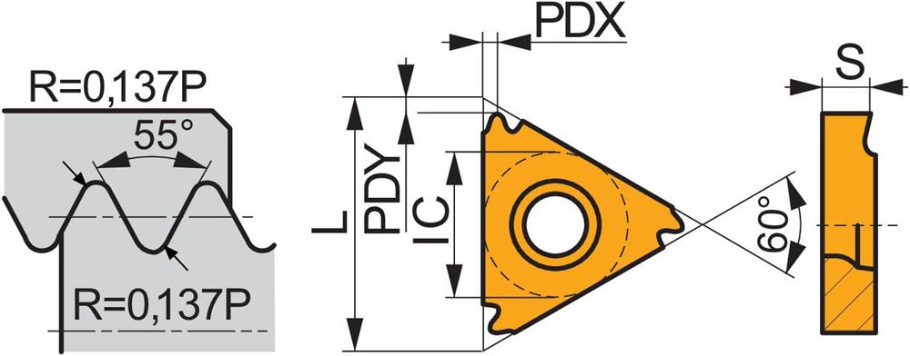 Einseitige Gewindedreh-Wendeschneidplatte · dreieckig mit einem Innenkreisdurchmesser von 9.525mm · für rechtsschneidende Werkzeuge für BSW-Außengewinde mit 14TPI · T8030 PVD beschichtet feinkörniges WC-Co-Hartmetall innerhalb der ISO-Substrats-Bereiche P25-P40/M20-M35 und K20-K40 zum zerspanen von Stahl · Edelstahl und Guss