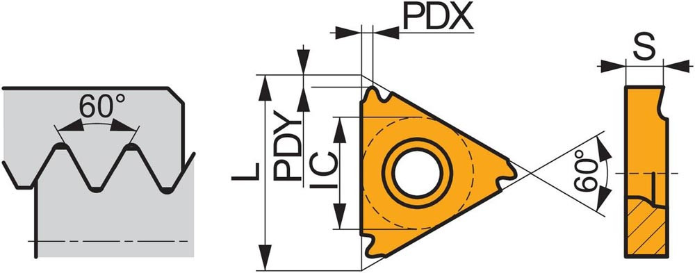Einseitige Gewindedreh-Wendeschneidplatte · dreieckig mit einem Innenkreisdurchmesser von 9.525mm · für rechtsschneidende Werkzeuge Teilprofil für ISO-metrisches und UN-Außengewinde mit 1.75 bis 3mm Steigung und 14 bis 8TPI · T8030 PVD beschichtet feinkörniges WC-Co-Hartmetall innerhalb der ISO-Substrats-Bereiche P25-P40/M20-M35 und K20-K40 zum zerspanen von Stahl · Edelstahl und Guss