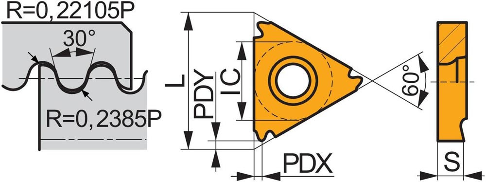 Einseitige Gewindedreh-Wendeschneidplatte · dreieckig mit einem Innenkreisdurchmesser von 9.525mm · für rechtsschneidende Werkzeuge für RD-Innengewinde mit 8TPI · T8030 PVD beschichtet feinkörniges WC-Co-Hartmetall innerhalb der ISO-Substrats-Bereiche P25-P40/M20-M35 und K20-K40 zum zerspanen von Stahl · Edelstahl und Guss