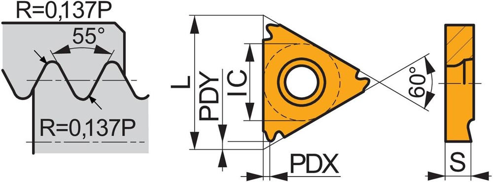 Einseitige Gewindedreh-Wendeschneidplatte · dreieckig mit einem Innenkreisdurchmesser von 9.525mm · für rechtsschneidende Werkzeuge für BSW-Innengewinde mit 11TPI · T8030 PVD beschichtet feinkörniges WC-Co-Hartmetall innerhalb der ISO-Substrats-Bereiche P25-P40/M20-M35 und K20-K40 zum zerspanen von Stahl · Edelstahl und Guss