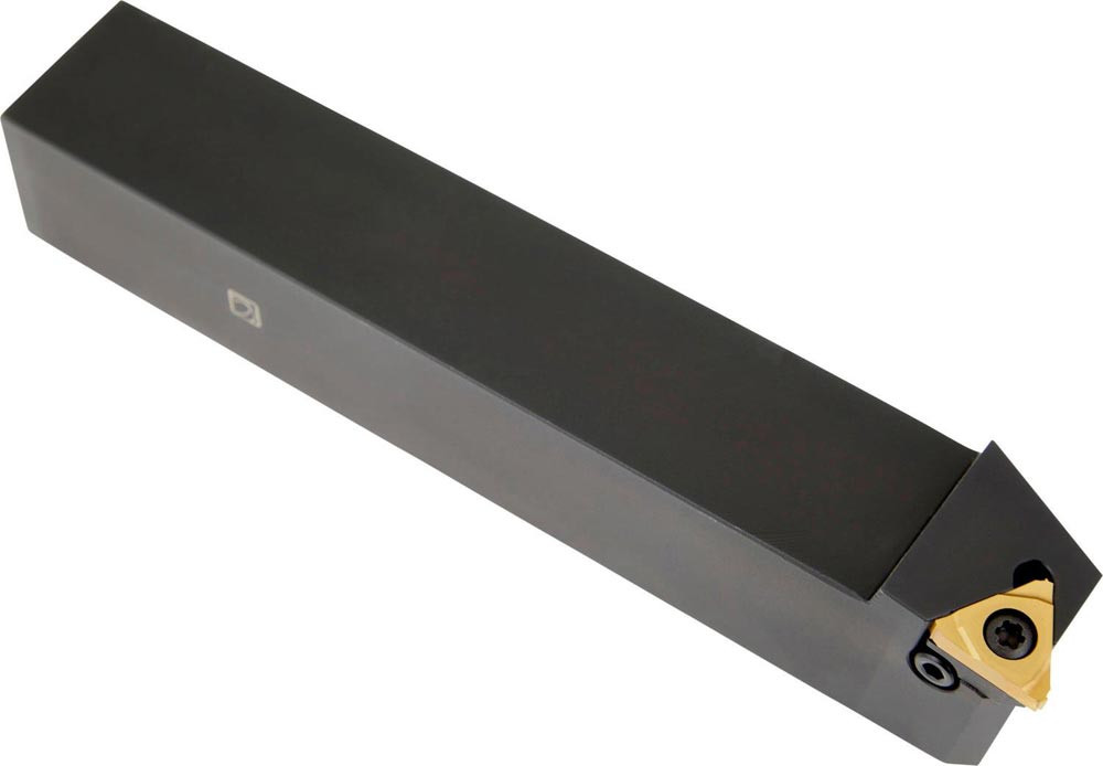 Schraubgeklemmte Gewindedrehhalter mit 1.5° Helixwinkel zum spannen einer dreieckigen Wendeschneidplatte mit einem Innenkreisdurchmesser von 12.7mm (Bezeichnung TN 22EL.. ) · linke Standardausführung mit Zylinderschaft · 25mm Werkzeughöhe 25mm Breite und 150mm Gesamtlänge zum Außengewinden · einstechen von Sicherungsringen · und einstechen von O-Ringen