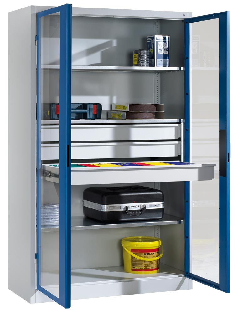 Großraum-Werkzeugschrank mit Sichfensterflügeltüren, 3 Schubladen unten, 4 Verstellböden, BxTxH 930x500x1950 mm, RAL 7035/5010 EP531427