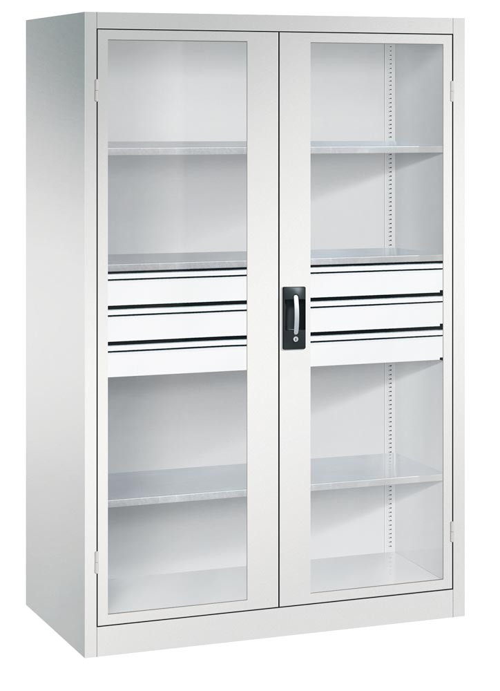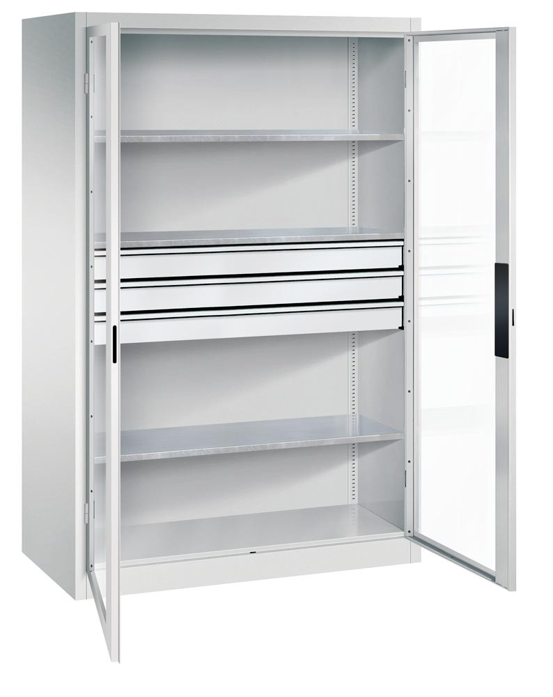 Großraum-Werkzeugschrank mit Sichfensterflügeltüren, 3 Schubladen unten, 4 Verstellböden, BxTxH 930x500x1950 mm, RAL 7035 EP531426
