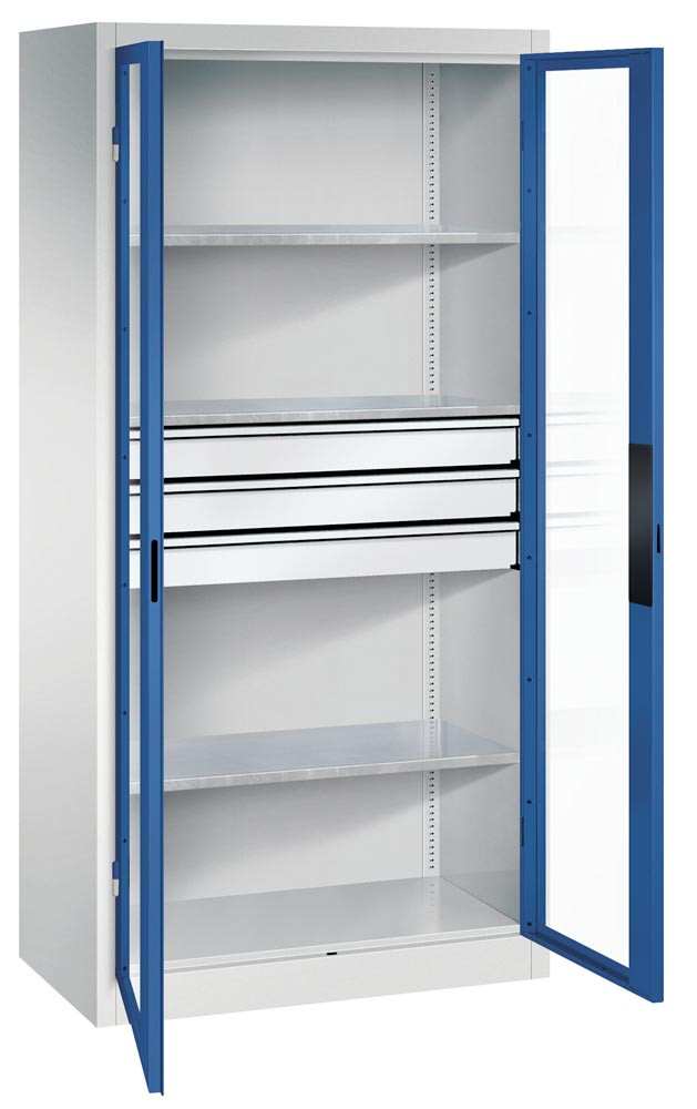 Großraum-Werkzeugschrank mit Sichfensterflügeltüren, 3 Schubladen unten, 4 Verstellböden, BxTxH 930x500x1950 mm, RAL 7035/5010 EP531427