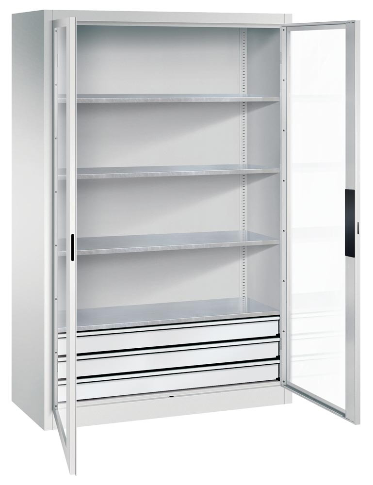 Großraum-Werkzeugschrank mit Sichfensterflügeltüren, 3 Schubladen unten, 4 Verstellböden, BxTxH 930x600x1950 mm, RAL 7035 EP531428