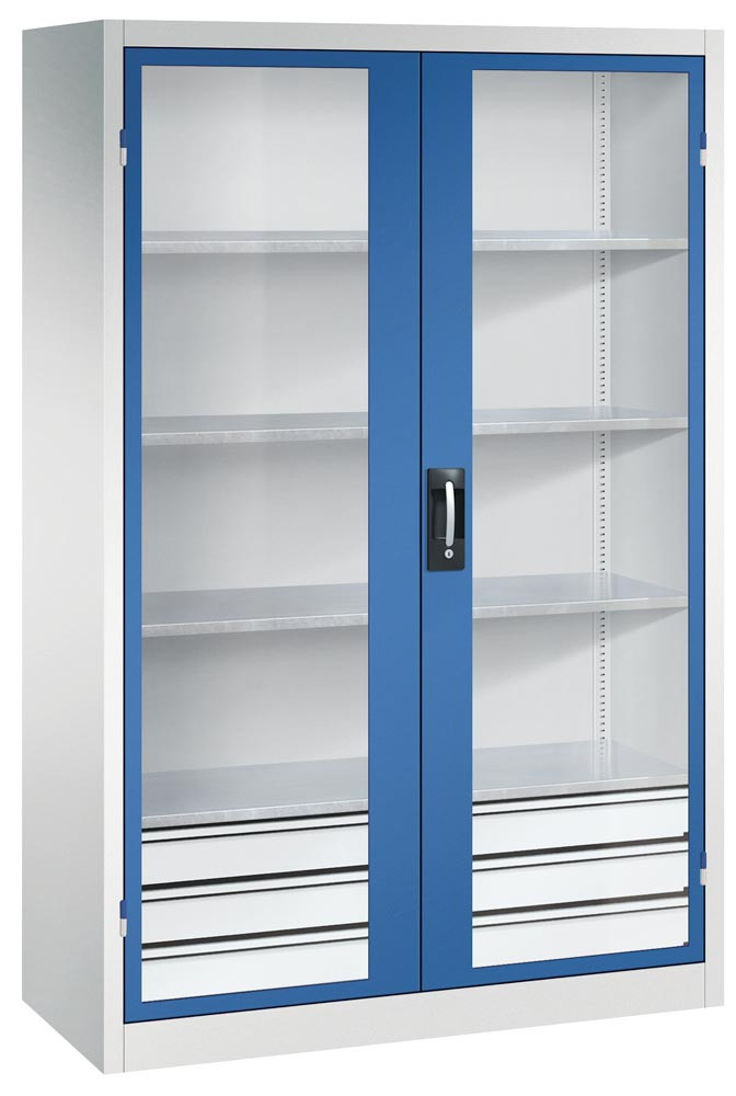 Großraum-Werkzeugschrank mit Sichfensterflügeltüren, 3 Schubladen unten, 4 Verstellböden, BxTxH 930x500x1950 mm, RAL 7035/5010 EP531427