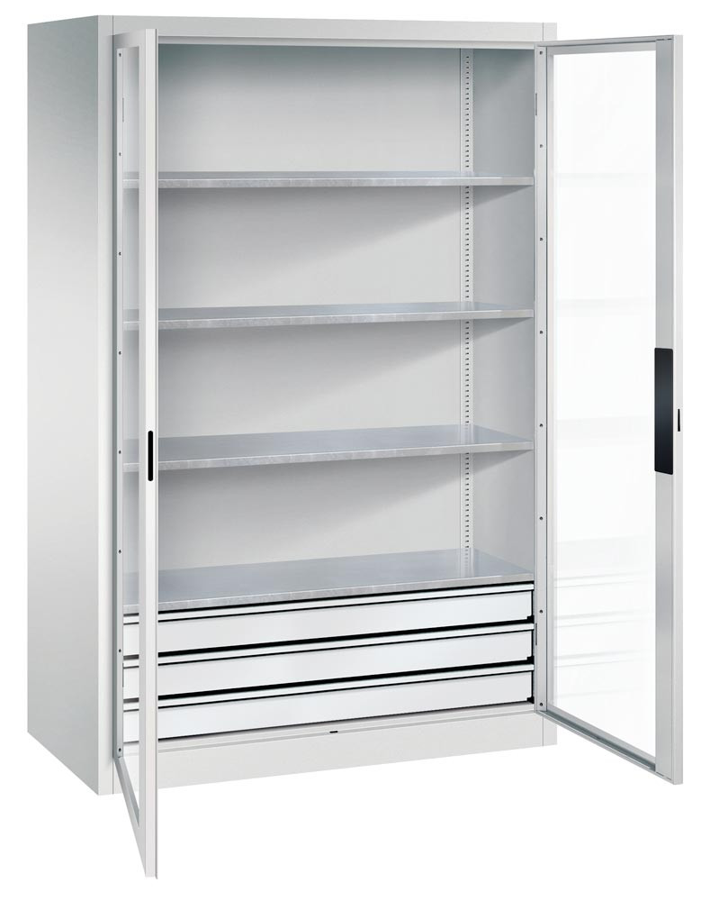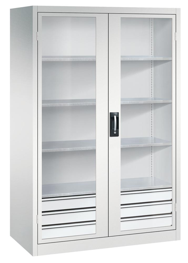 Großraum-Werkzeugschrank mit Sichfensterflügeltüren, 3 Schubladen unten, 4 Verstellböden, BxTxH 930x500x1950 mm, RAL 7035/5010 EP531427