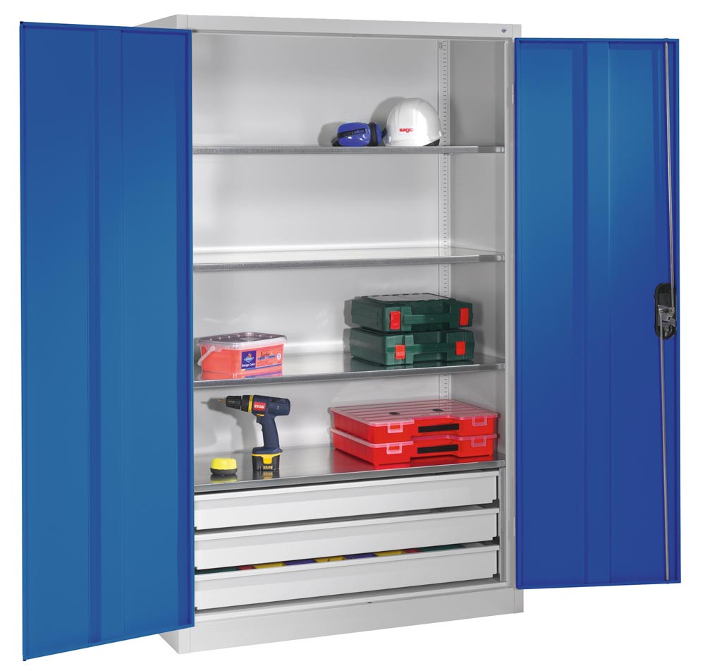 Großraum-Werkzeugschrank mit Vollblech-Flügeltüren, 3 Schubladen unten, 4 Verstellböden, BxTxH 930x500x1950 mm, RAL 7035/5010 EP533463