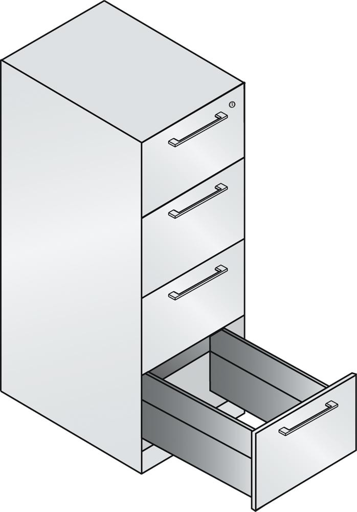 · Langlebige, körperschallgedämpfte Stahlkonstruktion mit hochwertiger Einbrennlackierung ∙ Schubladen auf 100 % ausziehbaren Kugelrollen-Teleskopführungen ∙ Schubladenfronten mit matt-verchromtem Bügelgriff ∙ Zentralverschluss mit Auszugsperre ∙ Austauschbarer Wechselkern, inkl. 2 Schlüsseln ∙ Inkl. selbstklebenden Kunststoff-Etikettenrahmen