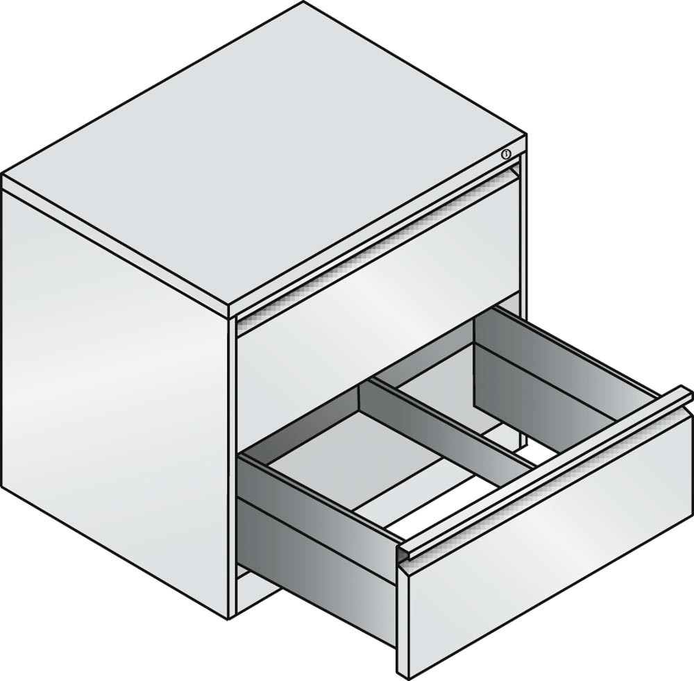 · Stabiles Stahlgehäuse, mit hoher Lebensdauer · Voll ausziehbare Schubladen mit durchgehender Griffleiste und geschlossenen Böden · Die Schubladen laufen auf Kugelrollen-Teleskopschienen · Doppel-Auszugsperre · Drehzylinderschloss, inkl. 2 Schlüsseln · Schubladenbelastung bis 50 kg (bei gleichmäßig verteilter Last) ∙ 5 Jahre Garantie auf die Schienenführung ∙ WeitereFarben RAL 9006 Weißaluminium und RAL 9016 Verkehrsweiß ohne Mehrpreis möglich