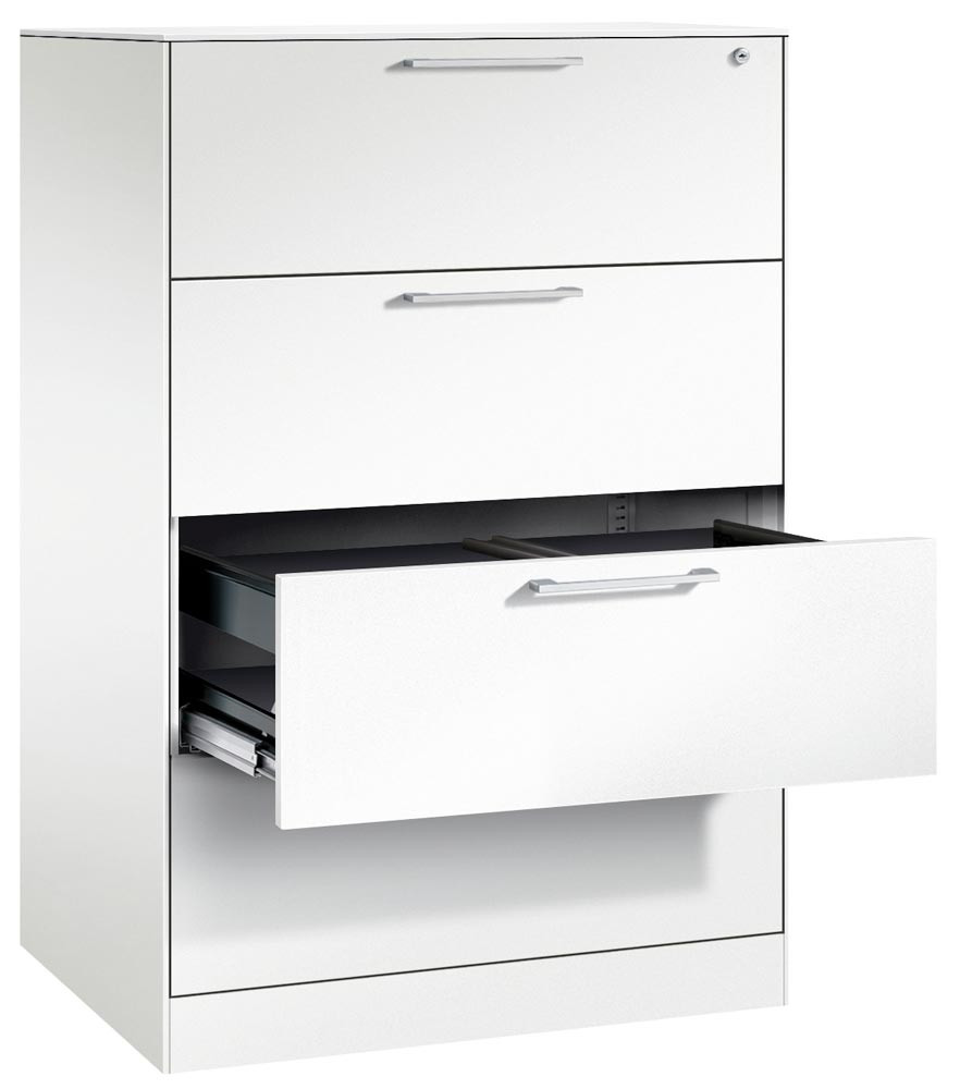 · Langlebige, körperschallgedämpfte Stahlkonstruktion mit hochwertiger Einbrennlackierung ∙ Schubladen auf 100 % ausziehbaren Kugelrollen-Teleskopführungen ∙ Schubladenfronten mit matt-verchromtem Bügelgriff ∙ Zentralverschluss mit Auszugsperre ∙ Austauschbarer Wechselkern, inkl. 2 Schlüsseln ∙ Inkl. selbstklebenden Kunststoff-Etikettenrahmen