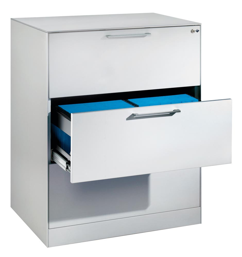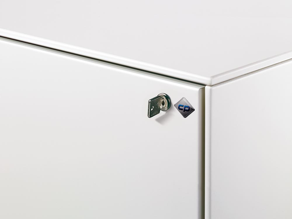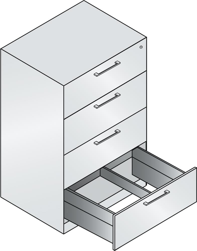 · Langlebige, körperschallgedämpfte Stahlkonstruktion mit hochwertiger Einbrennlackierung ∙ Schubladen auf 100 % ausziehbaren Kugelrollen-Teleskopführungen ∙ Schubladenfronten mit matt-verchromtem Bügelgriff ∙ Zentralverschluss mit Auszugsperre ∙ Austauschbarer Wechselkern, inkl. 2 Schlüsseln ∙ Inkl. selbstklebenden Kunststoff-Etikettenrahmen