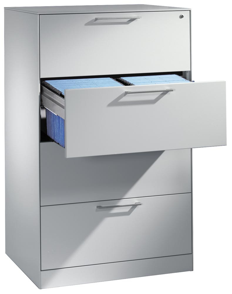 Hängeregistraturschrank, BxTxH 800x600x1298 mm, zweibahnig, 4 Schubladen, Bügelgriff, RAL 7035 lichtgrau